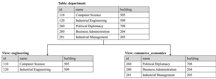 - ์ฌ์ฉ์์๊ฒ ์ ๊ทผ์ด ํ์ฉ๋ ๋ฐ์ดํฐ๋ง์ ์ ํ์ ์ผ๋ก ๋ณด์ฌ์ฃผ๊ธฐ ์ํด ํ๋ ์ด์์ ๊ธฐ๋ณธ ํ ์ด๋ธ๋ก๋ถํฐ ์ ๋๋ ๊ฐ์ ํ ์ด๋ธ